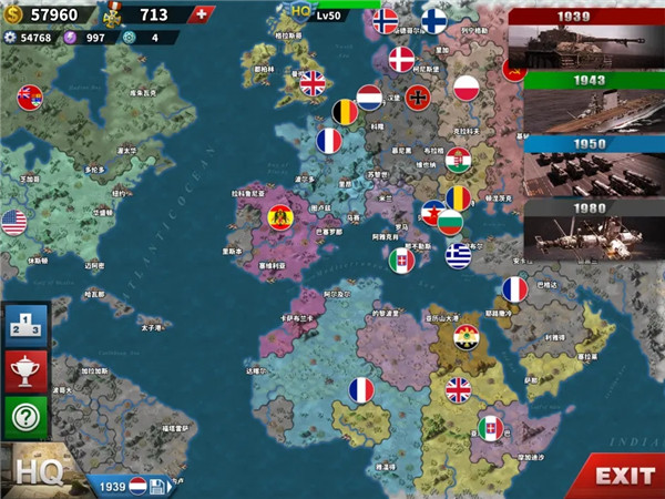 《世界征服者4》擁有獨特的年代系統功能鍵,位于界面右上角的年代選擇與國家分布嚴格對應真實歷史背景,主要劃分為二戰前期、二戰后期、冷戰和現代戰爭四大時期。每個年代都設有符合史實的對立陣營:二戰時期為軸心國與同盟國,冷戰時期為華約與北約,現代戰爭則是聯合國對抗毒蝎恐怖組織(該陣營不可操控)。游戲難度會隨著年代推進逐步提升,除1939年外,其他年代都需要通過完成對應劇情戰役來解鎖——比如想體驗1943年征服模式需先通關二戰歐洲劇本(任選陣營),1950年需通關二戰太平洋,1980年則需完成冷戰劇本。在HQ按鈕旁設有藍色進度保存鍵,每個年代都有獨立存檔位,但重新選擇國家會清除當前進度。這里特別介紹高手必備的SL(存檔讀檔)技巧,通過合理運用保存功能可以更高效地完成征服目標。